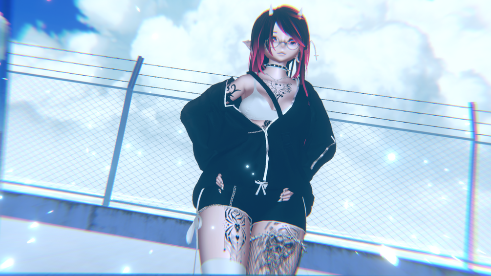 Head base: Onion#1515 Head texture: Onion#1515 (Edited by HawksVR) Body base: Pandaabear#9873 Body texture: ??? (will update when i find out) Backpack: Bobers#8584 Basic crop top: Hypervigilance#0001 Belt/garter chain: babydoll~#0666 Undergarments: ??? (will update when i find out) Choker: Queen_Rose#8989 Fishnet: Q.#1214 arm fishnets: Bobers#8584 Pasties: Cupkake#6666 (Nitro) Piercings: jellybean#6199 Chest chain: pink.wings#0695 Side shirt: ??? (will update when i find out) Shoes: Nepnewp#4664 Shorts: moobean#8827 Socks: Maible#8888 Straps: https://aantara.gumroad.com/l/amLGY Jacket: https://yuriyarawr.gumroad.com/l/OseHF? Long Hair, ponytail: https://wetcat.gumroad.com/ Elf ears: Bobers#8584 Cat ears: Bobers#8584 Puppy ears: Boobers#8584 Horns: Cupkake#6666 (Nitro) Gas mask: moonlight peach#3252 Fluffy Tail: https://yukina.gumroad.com/l/AWHCk Devil tail: DOGU#0271 Visor: Hayweee#1999 Glasses: https://ikshop.booth.pm/items/1483281 Spring joints: https://brex.booth.pm/ Locomotion: https://wetcat.gumroad.com/l/locomotionVRC